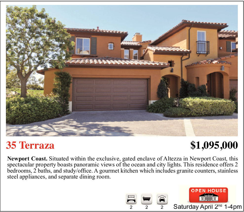 35 Terraza $1,095,000 Newport Coast. Situated within the exclusive, gated enclave of Altezza in Newport Coast, this spectacular property boasts panoramic views of the ocean and city lights. This residence offers 2 bedrooms, 2 baths, and study/office. A gourmet kitchen which includes granite counters, stainless steel appliances, and separate dining room. 2 2 2 Saturday April 2 nd 1-4pm