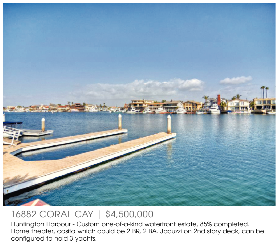 16882 CORAL CAY | $4,500,000 Huntington Harbour - Custom one-of-a-kind waterfront estate, 85% completed. Home theater, casita which could be 2 BR, 2 BA. Jacuzzi on 2nd story deck, can be configured to hold 3 yachts.