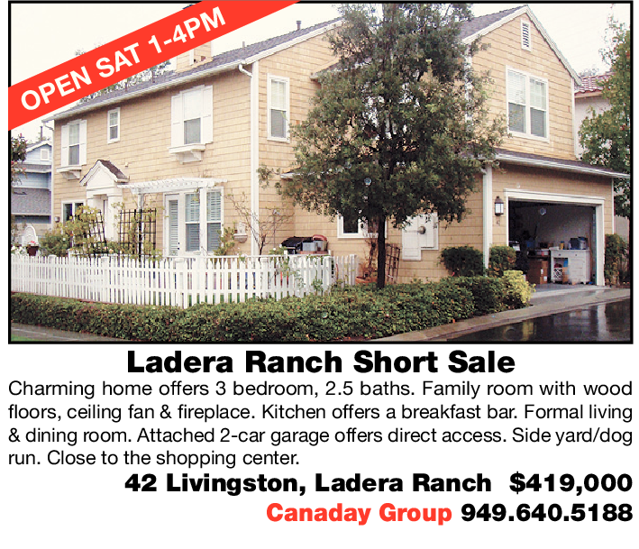 Ladera Ranch Short Sale Charming home offers 3 bedroom, 2.5 baths. Family room with wood floors, ceiling fan & fireplace. Kitchen offers a breakfast bar. Formal living & dining room. Attached 2-car garage offers direct access. Side yard/dog run. Close to the shopping center. 42 Livingston, Ladera Ranch $419,000 Canaday Group 949.640.5188