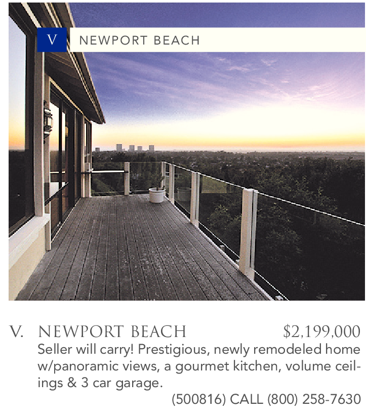 NEWPORT BEACH $2,199,000 Seller will carry! Prestigious, newly remodeled home w/panoramic views, a gourmet kitchen, volume ceilings & 3 car garage.