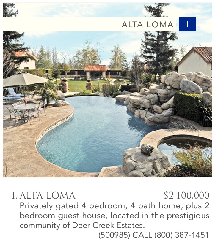 I. ALTA LOMA $2,100,000 Privately gated 4 bedroom, 4 bath home, plus 2 bedroom guest house, located in the prestigious community of Deer Creek Estates.