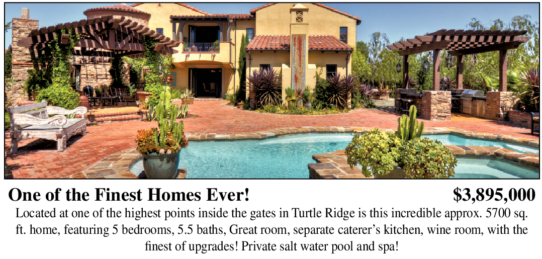 One of the Finest Homes Ever! $3,895,000 Located at one of the highest points inside the gates in Turtle Ridge is this incredible approx. 5700 sq. ft. home, featuring 5 bedrooms, 5.5 baths, Great room, separate caterer’s kitchen, wine room, with the finest of upgrades! Private salt water pool and spa!