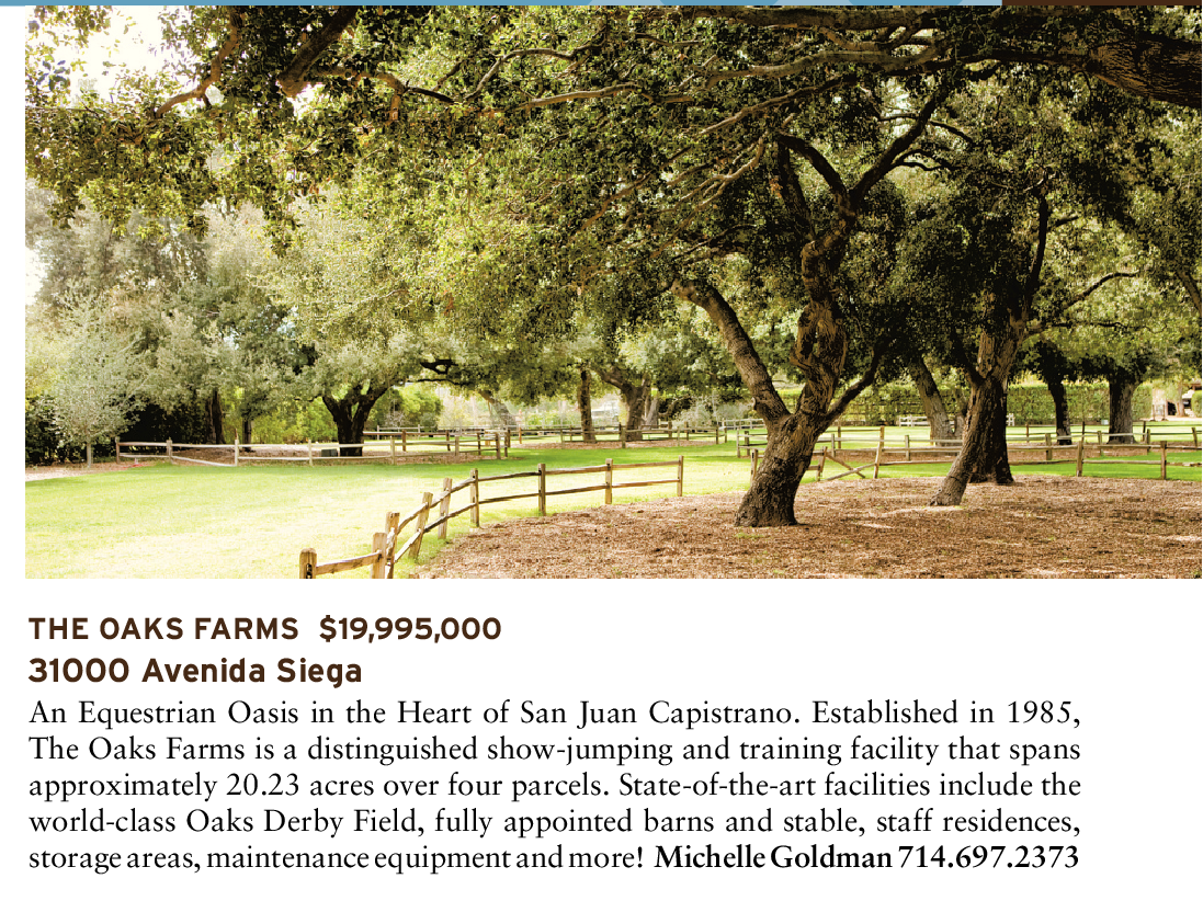 THE OAKS FARMS $19,995,000 31000 Avenida Siega An Equestrian Oasis in the Heart of San Juan Capistrano. Established in 1985, The Oaks Farms is a distinguished show-jumping and training facility that spans approximately 20.23 acres over four parcels. State-of-the-art facilities include the world-class Oaks Derby Field, fully appointed barns and stable, staff residences, storage areas, maintenance equipment and more! Michelle Goldman 714.697.2373