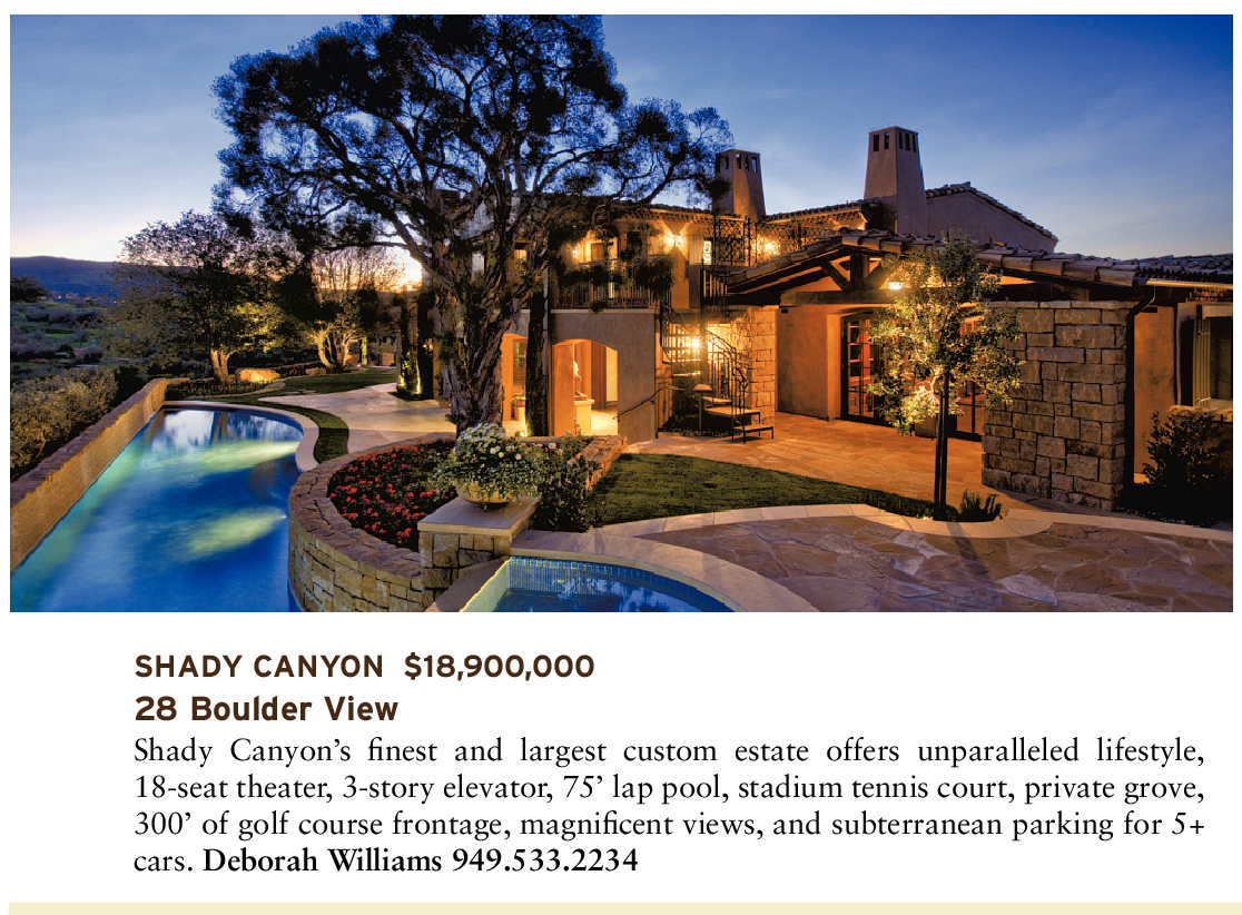 SHADY CANYON $18,900,000 28 Boulder View Shady Canyon’s finest and largest custom estate offers unparalleled lifestyle, 18-seat theater, 3-story elevator, 75’ lap pool, stadium tennis court, private grove, 300’ of golf course frontage, magnificent views, and subterranean parking for 5+ cars. Deborah Williams 949.533.2234