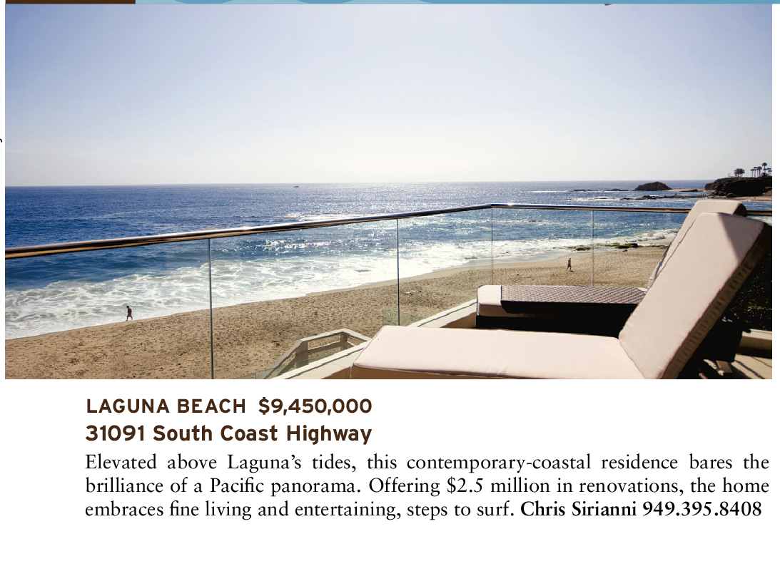 LAGUNA BEACH $9,450,000 31091 South Coast Highway Elevated above Laguna’s tides, this contemporary-coastal residence bares the brilliance of a Pacific panorama. Offering $2.5 million in renovations, the home embraces fine living and entertaining, steps to surf. Chris Sirianni 949.395.8408