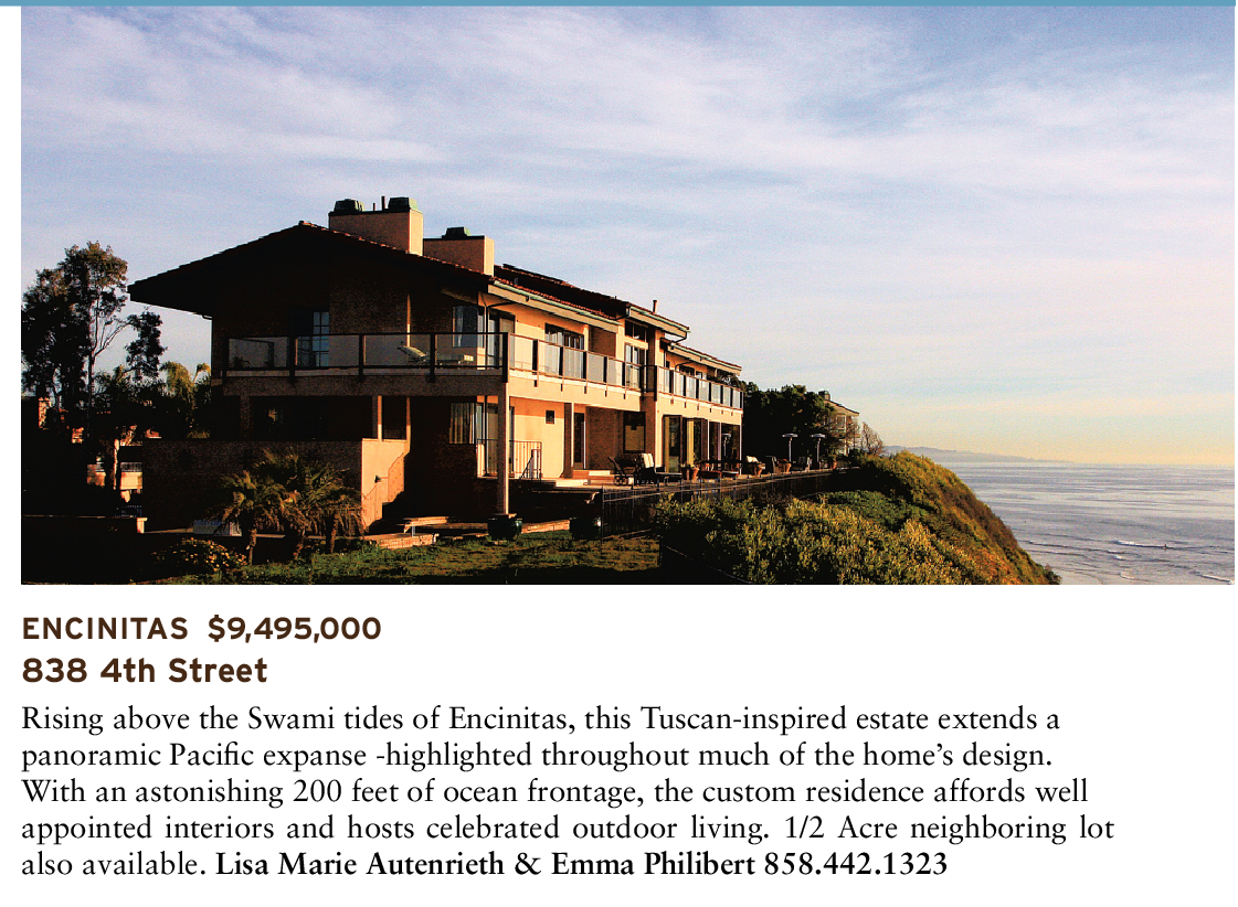 Rising above the Swami tides of Encinitas, this Tuscan-inspired estate extends a panoramic Pacific expanse -highlighted throughout much of the home’s design. With an astonishing 200 feet of ocean frontage, the custom residence affords well appointed interiors and hosts celebrated outdoor living. 1/2 Acre neighboring lot also available. Lisa Marie Autenrieth & Emma Philibert 858.442.1323