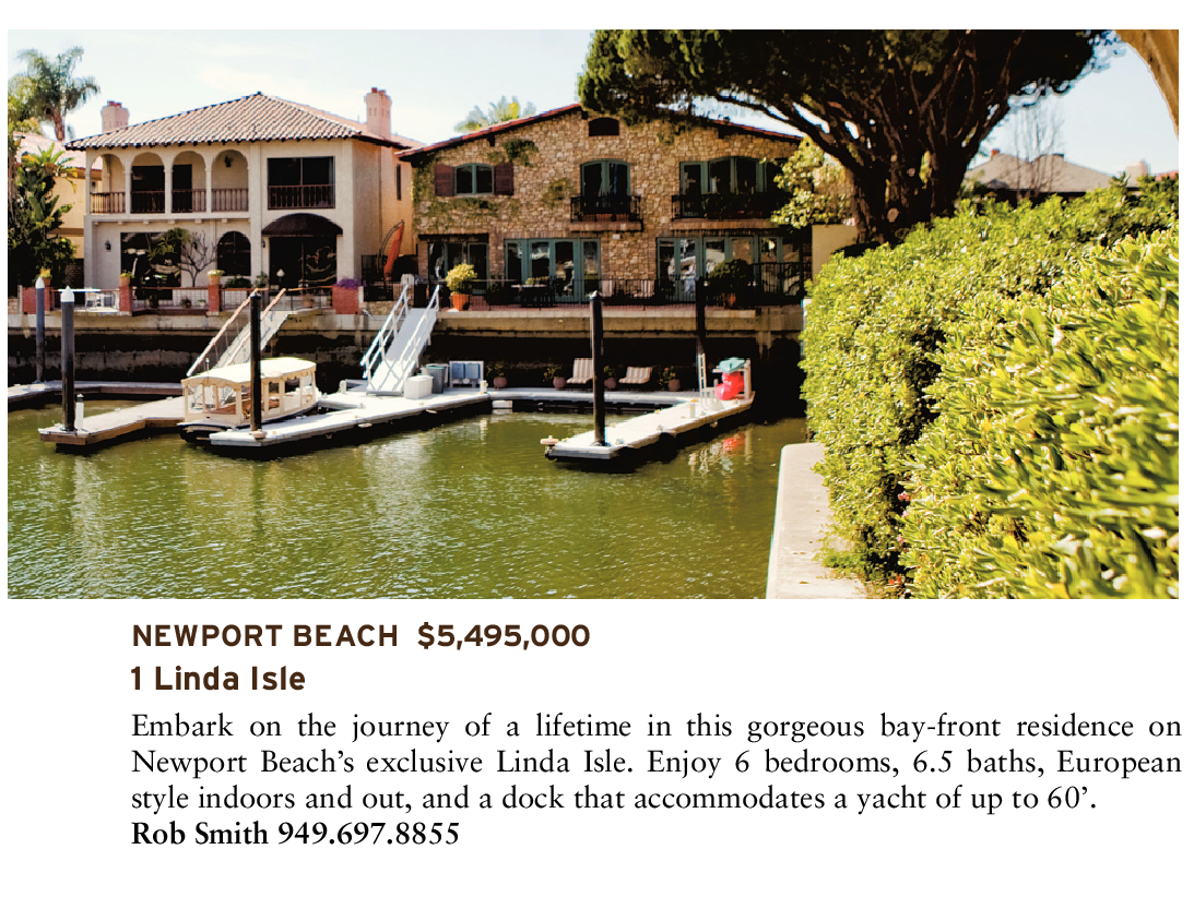 NEWPORT BEACH $5,495,000 1 Linda Isle Embark on the journey of a lifetime in this gorgeous bay-front residence on Newport Beach’s exclusive Linda Isle. Enjoy 6 bedrooms, 6.5 baths, European style indoors and out, and a dock that accommodates a yacht of up to 60’. Rob Smith 949.697.8855