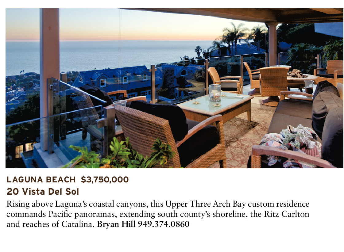 LAGUNA BEACH $3,750,000 20 Vista Del Sol Rising above Laguna’s coastal canyons, this Upper Three Arch Bay custom residence commands Pacific panoramas, extending south county’s shoreline, the Ritz Carlton and reaches of Catalina. Bryan Hill 949.374.0860