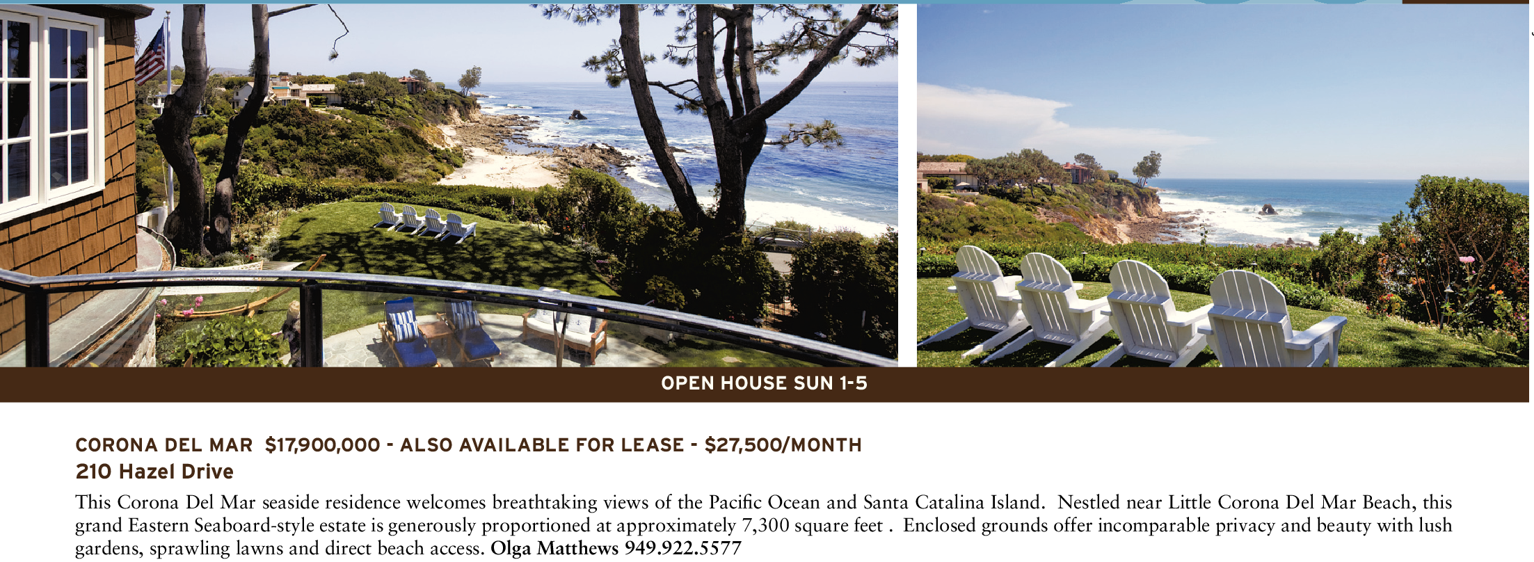 CORONA DEL MAR $17,900,000 - ALSO AVAILABLE FOR LEASE - $27,500/MONTH 210 Hazel Drive This Corona Del Mar seaside residence welcomes breathtaking views of the Pacific Ocean and Santa Catalina Island. Nestled near Little Corona Del Mar Beach, this grand Eastern Seaboard-style estate is generously proportioned at approximately 7,300 square feet . Enclosed grounds offer incomparable privacy and beauty with lush gardens, sprawling lawns and direct beach access. Olga Matthews 949.922.5577 OPEN HOUSE SUN 1-5