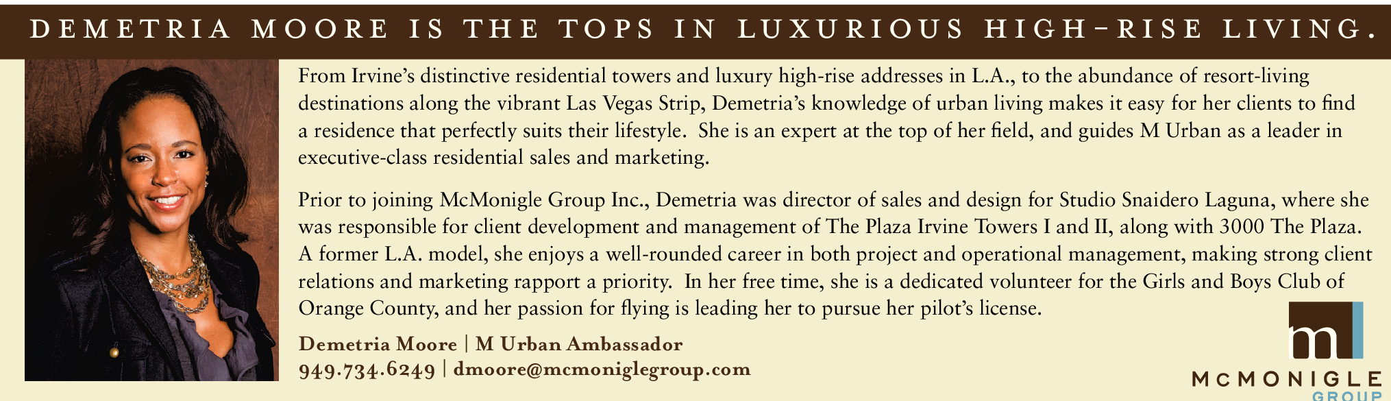 D E M E T R I A M O O R E I S T H E T O P S I N L U X U R I O U S H I G H - R I S E L I V I N G . From Irvine’s distinctive residential towers and luxury high-rise addresses in L.A., to the abundance of resort-living destinations along the vibrant Las Vegas Strip, Demetria’s knowledge of urban living makes it easy for her clients to find a residence that perfectly suits their lifestyle. She is an expert at the top of her field, and guides M Urban as a leader in executive-class residential sales and marketing. Prior to joining McMonigle Group Inc., Demetria was director of sales and design for Studio Snaidero Laguna, where she was responsible for client development and management of The Plaza Irvine Towers I and II, along with 3000 The Plaza. A former L.A. model, she enjoys a well-rounded career in both project and operational management, making strong client relations and marketing rapport a priority. In her free time, she is a dedicated volunteer for the Girls and Boys Club of Orange County, and her passion for flying is leading her to pursue her pilot’s license. Demetria Moore | M Urban Ambassador 949.734.6249 | dmoore@mcmoniglegroup.com