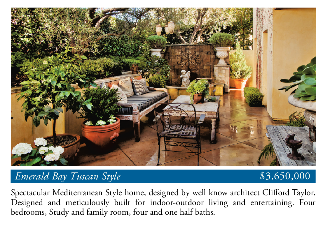 Emerald Bay Tuscan Style $3,650,000 Spectacular Mediterranean Style home, designed by well know architect Clifford Taylor. Designed and meticulously built for indoor-outdoor living and entertaining. Four bedrooms, Study and family room, four and one half baths.