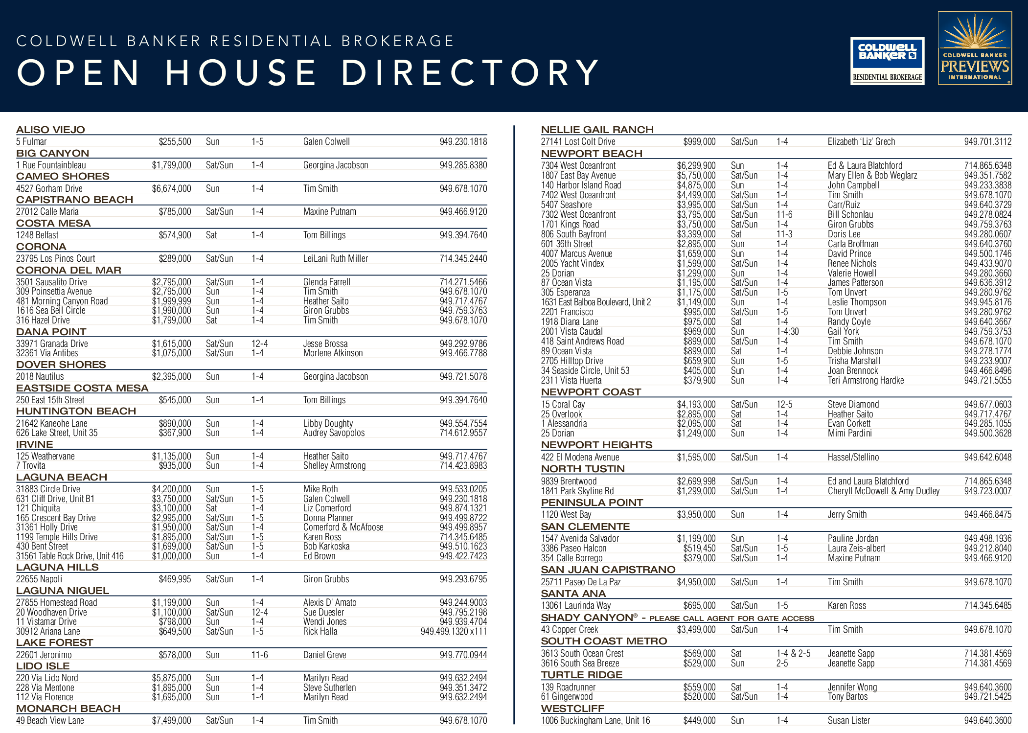 ALISO VIEJO 5 Fulmar $255,500 Sun 1-5 Galen Colwell 949.230.1818 BIG CANYON 1 Rue Fountainbleau $1,799,000 Sat/Sun 1-4 Georgina Jacobson 949.285.8380 CAMEO SHORES 4527 Gorham Drive $6,674,000 Sun 1-4 Tim Smith 949.678.1070 CAPISTRANO BEACH 27012 Calle Maria $785,000 Sat/Sun 1-4 Maxine Putnam 949.466.9120 COSTA MESA 1248 Belfast $574,900 Sat 1-4 Tom Billings 949.394.7640 CORONA 23795 Los Pinos Court $289,000 Sat/Sun 1-4 LeiLani Ruth Miller 714.345.2440 CORONA DEL MAR 3501 Sausalito Drive $2,795,000 Sat/Sun 1-4 Glenda Farrell 714.271.5466 309 Poinsettia Avenue $2,795,000 Sun 1-4 Tim Smith 949.678.1070 481 Morning Canyon Road $1,999,999 Sun 1-4 Heather Saito 949.717.4767 1616 Sea Bell Circle $1,990,000 Sun 1-4 Giron Grubbs 949.759.3763 316 Hazel Drive $1,799,000 Sat 1-4 Tim Smith 949.678.1070 DANA POINT 33971 Granada Drive $1,615,000 Sat/Sun 12-4 Jesse Brossa 949.292.9786 32361 Via Antibes $1,075,000 Sat/Sun 1-4 Morlene Atkinson 949.466.7788 DOVER SHORES 2018 Nautilus $2,395,000 Sun 1-4 Georgina Jacobson 949.721.5078 EASTSIDE COSTA MESA 250 East 15th Street $545,000 Sun 1-4 Tom Billings 949.394.7640 HUNTINGTON BEACH 21642 Kaneohe Lane $890,000 Sun 1-4 Libby Doughty 949.554.7554 626 Lake Street, Unit 35 $367,900 Sun 1-4 Audrey Savopolos 714.612.9557 IRVINE 125 Weathervane $1,135,000 Sun 1-4 Heather Saito 949.717.4767 7 Trovita $935,000 Sun 1-4 Shelley Armstrong 714.423.8983 LAGUNA BEACH 31883 Circle Drive $4,200,000 Sun 1-5 Mike Roth 949.533.0205 631 Cliff Drive, Unit B1 $3,750,000 Sat/Sun 1-5 Galen Colwell 949.230.1818 121 Chiquita $3,100,000 Sat 1-4 Liz Comerford 949.874.1321 165 Crescent Bay Drive $2,995,000 Sat/Sun 1-5 Donna Pfanner 949.499.8722 31361 Holly Drive $1,950,000 Sat/Sun 1-4 Comerford & McAfoose 949.499.8957 1199 Temple Hills Drive $1,895,000 Sat/Sun 1-5 Karen Ross 714.345.6485 430 Bent Street $1,699,000 Sat/Sun 1-5 Bob Karkoska 949.510.1623 31561 Table Rock Drive, Unit 416 $1,000,000 Sun 1-4 Ed Brown 949.422.7423 LAGUNA HILLS 22655 Napoli $469,995 Sat/Sun 1-4 Giron Grubbs 949.293.6795 LAGUNA NIGUEL 27855 Homestead Road $1,199,000 Sun 1-4 Alexis D’ Amato 949.244.9003 20 Woodhaven Drive $1,100,000 Sat/Sun 12-4 Sue Duesler 949.795.2198 11 Vistamar Drive $798,000 Sun 1-4 Wendi Jones 949.939.4704 30912 Ariana Lane $649,500 Sat/Sun 1-5 Rick Halla 949.499.1320 x111 LAKE FOREST 22601 Jeronimo $578,000 Sun 11-6 Daniel Greve 949.770.0944 LIDO ISLE 220 Via Lido Nord $5,875,000 Sun 1-4 Marilyn Read 949.632.2494 228 Via Mentone $1,895,000 Sun 1-4 Steve Sutherlen 949.351.3472 112 Via Florence $1,695,000 Sun 1-4 Marilyn Read 949.632.2494 MONARCH BEACH 49 Beach View Lane $7,499,000 Sat/Sun 1-4 Tim Smith 949.678.1070