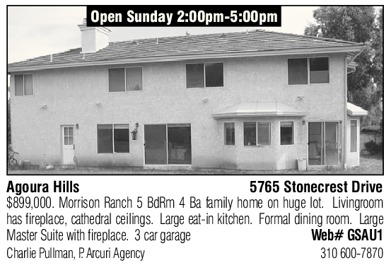 Open Sunday 2:00pm-5:00pm Agoura Hills 5765 Stonecrest Drive $899,000. Morrison Ranch 5 BdRm 4 Ba family home on huge lot. Livingroom has fireplace, cathedral ceilings. Large eat-in kitchen. Formal dining room. Large Master Suite with fireplace. 3 car garage Web# GSAU1 Charlie Pullman, P. Arcuri Agency 310 600-7870