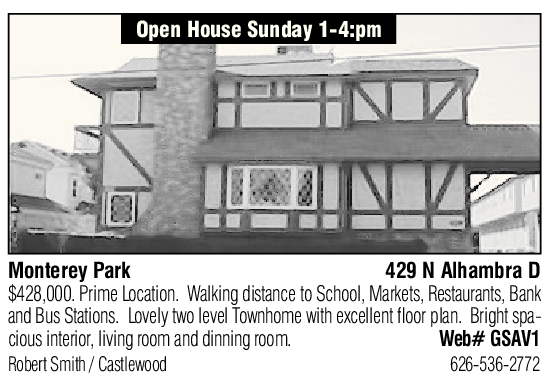 Open House Sunday 1-4:pm Monterey Park 429 N Alhambra D $428,000. Prime Location. Walking distance to School, Markets, Restaurants, Bank and Bus Stations. Lovely two level Townhome with excellent floor plan. Bright spacious interior, living room and dinning room. Web# GSAV1 Robert Smith / Castlewood 626-536-2772