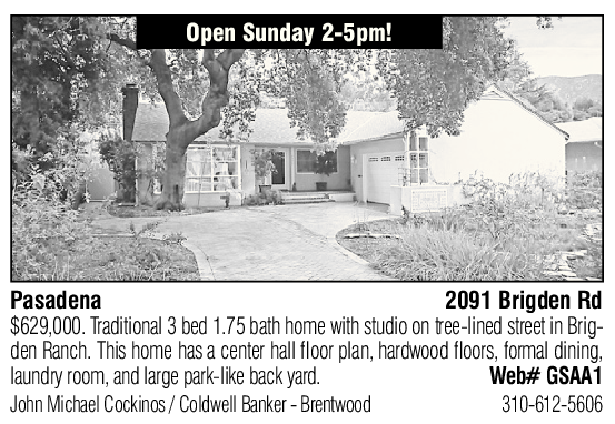 Pasadena 2091 Brigden Rd $629,000. Traditional 3 bed 1.75 bath home with studio on tree-lined street in Brigden Ranch. This home has a center hall floor plan, hardwood floors, formal dining, laundry room, and large park-like back yard. Web# GSAA1 John Michael Cockinos / Coldwell Banker - Brentwood 310-612-5606
