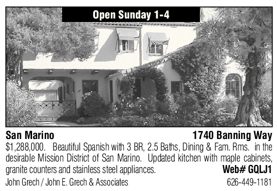 Open Sunday 1-4 San Marino 1740 Banning Way desirable Mission District of San Marino. Updated kitchen with maple cabinets, $1,288,000. Beautiful Spanish with 3 BR, 2.5 Baths, Dining & Fam. Rms. in the granite counters and stainless steel appliances. Web# GQLJ1 John Grech / John E. Grech & Associates 626-449-1181 See also