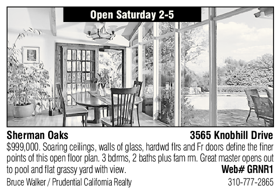 Sherman Oaks 3565 Knobhill Drive points of this open floor plan. 3 bdrms, 2 baths plus fam rm. Great master opens out $999,000. Soaring ceilings, walls of glass, hardwd flrs and Fr doors define the finer to pool and flat grassy yard with view. Web# GRNR1 Bruce Walker / Prudential California Realty 310-777-2865