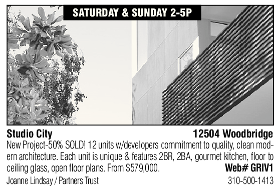 SATURDAY & SUNDAY 2-5P Studio City 12504 Woodbridge ern architecture. Each unit is unique & features 2BR, 2BA, gourmet kitchen, floor to New Project-50% SOLD! 12 units w/developers commitment to quality, clean mod- ceiling glass, open floor plans. From $579,000. Web# GRIV1 Joanne Lindsay / Partners Trust 310-500-1413