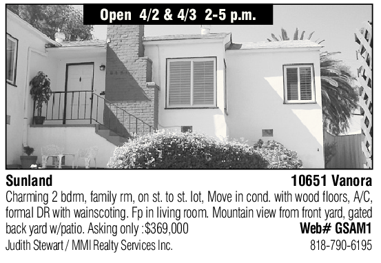 Open 4/2 & 4/3 2-5 p.m. Sunland 10651 Vanora Charming 2 bdrm, family rm, on st. to st. lot, Move in cond. with wood floors, A/C, formal DR with wainscoting. Fp in living room. Mountain view from front yard, gated back yard w/patio. Asking only :$369,000 Web# GSAM1 Judith Stewart / MMI Realty Services Inc. 818-790-6195