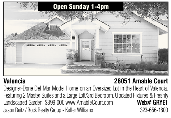 Open Sunday 1-4pm Valencia 26051 Amable Court Designer-Done Del Mar Model Home on an Oversized Lot in the Heart of Valencia. Featuring 2 Master Suites and a Large Loft/3rd Bedroom. Updated Fixtures & Freshly Landscaped Garden. $399,000 www.AmableCourt.com Web# GRYE1 Jason Reitz / Rock Realty Group - Keller Williams 323-656-1800