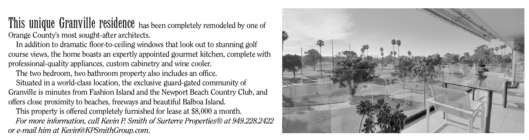 This unique Granville residence has been completely remodeled by one of Orange County’s most sought-after architects. In addition to dramatic floor-to-ceiling windows that look out to stunning golf course views, the home boasts an expertly appointed gourmet kitchen, complete with professional-quality appliances, custom cabinetry and wine cooler. The two bedroom, two bathroom property also includes an office. Situated in a world-class location, the exclusive guard-gated community of Granville is minutes from Fashion Island and the Newport Beach Country Club, and offers close proximity to beaches, freeways and beautiful Balboa Island. This property is offered completely furnished for lease at $8,000 a month. For more information, call Kevin P. Smith of Surterre Properties® at 949.228.2422 or e-mail him at Kevin@KPSmithGroup.com.