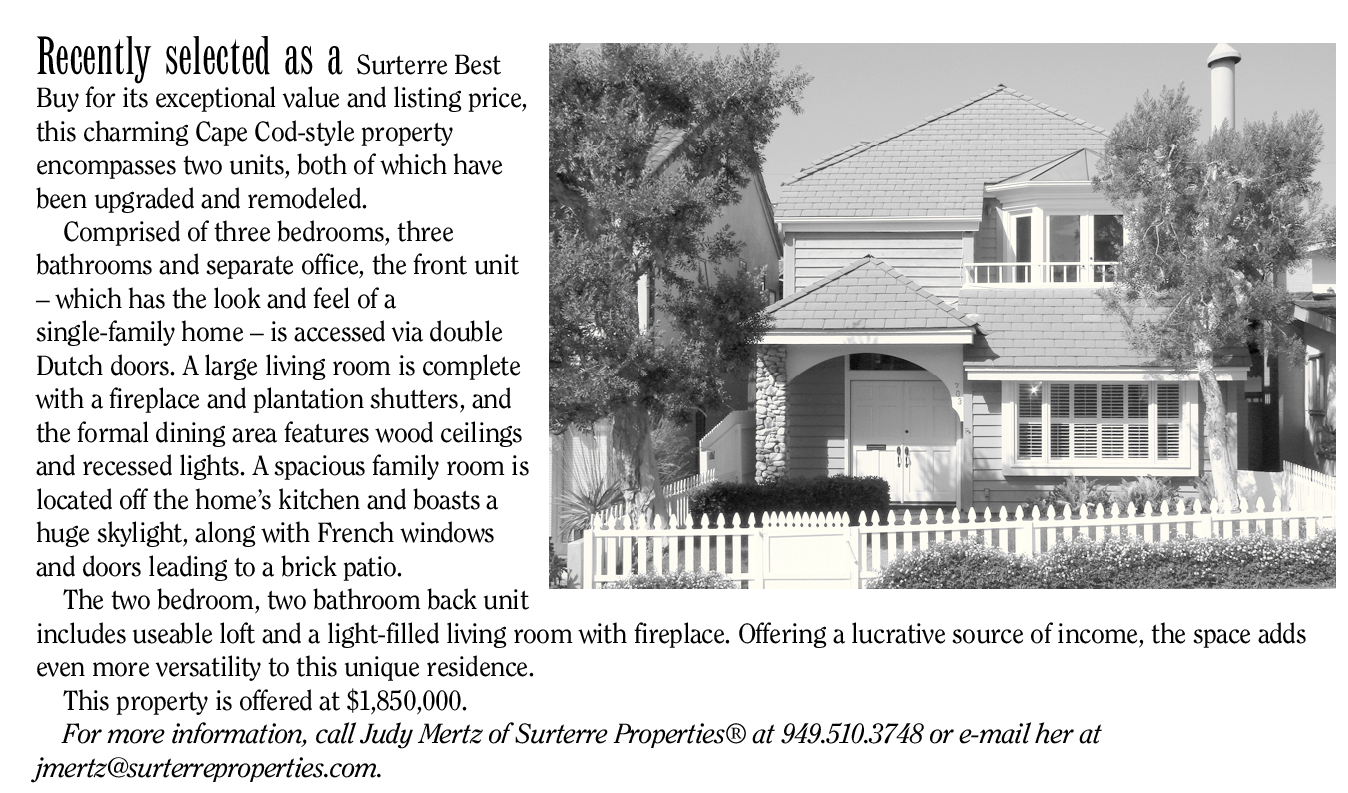 Recently selected as a Surterre Best Buy for its exceptional value and listing price, this charming Cape Cod-style property encompasses two units, both of which have been upgraded and remodeled. Comprised of three bedrooms, three bathrooms and separate office, the front unit – which has the look and feel of a single-family home – is accessed via double Dutch doors. A large living room is complete with a fireplace and plantation shutters, and the formal dining area features wood ceilings and recessed lights. A spacious family room is located off the home’s kitchen and boasts a huge skylight, along with French windows and doors leading to a brick patio. The two bedroom, two bathroom back unit includes useable loft and a light-filled living room with fireplace. Offering a lucrative source of income, the space adds even more versatility to this unique residence. This property is offered at $1,850,000. For more information, call Judy Mertz of Surterre Properties® at 949.510.3748 or e-mail her at jmertz@surterreproperties.com.