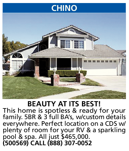 CHINO BEAUTY AT ITS BEST! This home is spotless & ready for your family. 5BR & 3 full BA’s, w/custom details everywhere. Perfect location on a CDS w/ plenty of room for your RV & a sparkling pool & spa. All just $465,000. (500569) CALL (888) 307-0052