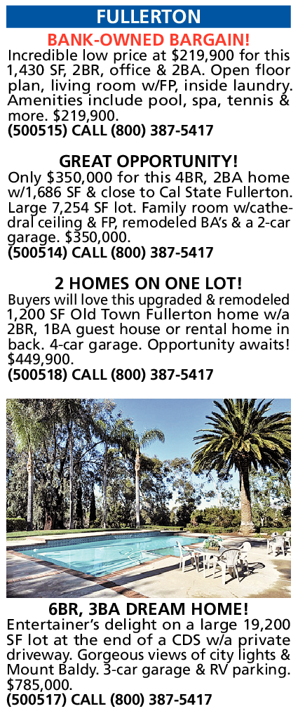 Only $350,000 for this 4BR, 2BA home w/1,686 SF & close to Cal State Fullerton. Large 7,254 SF lot. Family room w/cathedral ceiling & FP, remodeled BA’s & a 2-car garage. $350,000. (500514) CALL (800) 387-5417