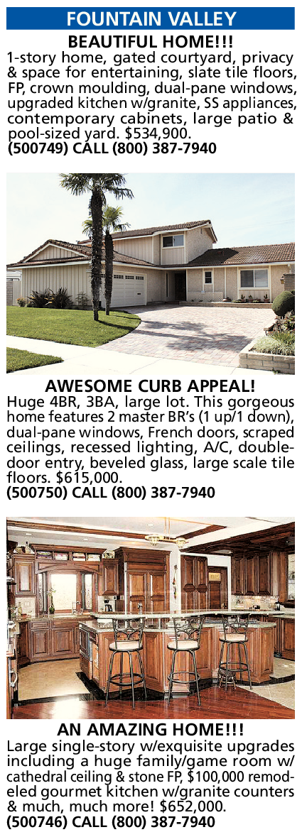 Huge 4BR, 3BA, large lot. This gorgeous home features 2 master BR’s (1 up/1 down), dual-pane windows, French doors, scraped ceilings, recessed lighting, A/C, doubledoor entry, beveled glass, large scale tile floors. $615,000. (500750) CALL (800) 387-7940