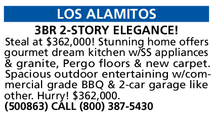 LOS ALAMITOS 3BR 2-STORY ELEGANCE! Steal at $362,000! Stunning home offers gourmet dream kitchen w/SS appliances & granite, Pergo floors & new carpet. Spacious outdoor entertaining w/commercial grade BBQ & 2-car garage like other. Hurry! $362,000. (500863) CALL (800) 387-5430