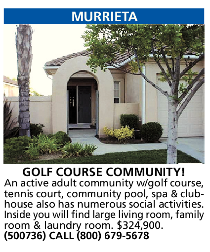 MURRIETA GOLF COURSE COMMUNITY! An active adult community w/golf course, tennis court, community pool, spa & clubhouse also has numerous social activities. Inside you will find large living room, family room & laundry room. $324,900. (500736) CALL (800) 679-5678