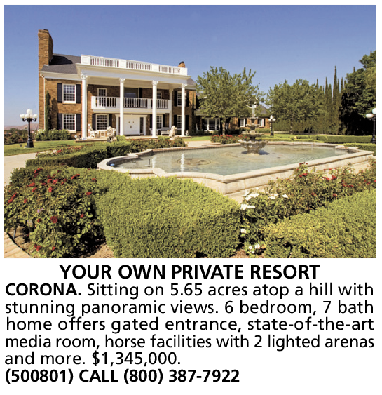 YOUR OWN PRIVATE RESORT CORONA. Sitting on 5.65 acres atop a hill with stunning panoramic views. 6 bedroom, 7 bath home offers gated entrance, state-of-the-art media room, horse facilities with 2 lighted arenas and more. $1,345,000. (500801) CALL (800) 387-7922