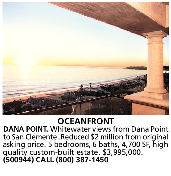 OCEANFRONT DANA POINT. Whitewater views from Dana Point to San Clemente. Reduced $2 million from original asking price. 5 bedrooms, 6 baths, 4,700 SF, high quality custom-built estate. $3,995,000.