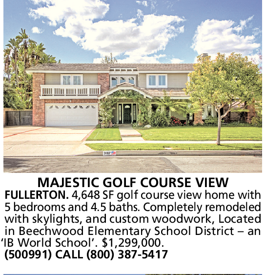 MAJESTIC GOLF COURSE VIEW FULLERTON. 4,648 SF golf course view home with 5 bedrooms and 4.5 baths. Completely remodeled with skylights, and custom woodwork, Located in Beechwood Elementary School District – an ‘IB World School’. $1,299,000.