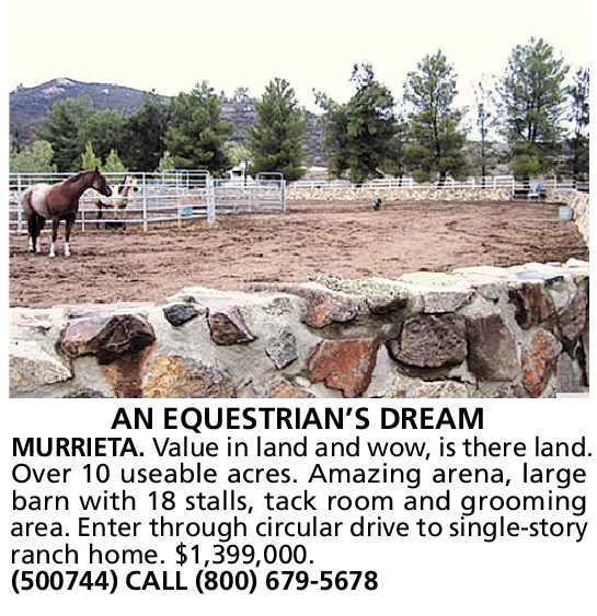 AN EQUESTRIAN’S DREAM MURRIETA. Value in land and wow, is there land. Over 10 useable acres. Amazing arena, large barn with 18 stalls, tack room and grooming area. Enter through circular drive to single-story ranch home. $1,399,000. (500744) CALL (800) 679-5678