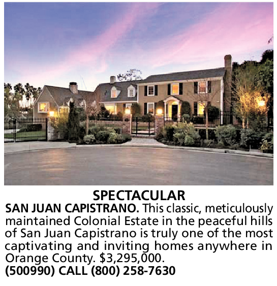 SPECTACULAR SAN JUAN CAPISTRANO. This classic, meticulously maintained Colonial Estate in the peaceful hills of San Juan Capistrano is truly one of the most captivating and inviting homes anywhere in Orange County. $3,295,000. (500990) CALL (800) 258-7630