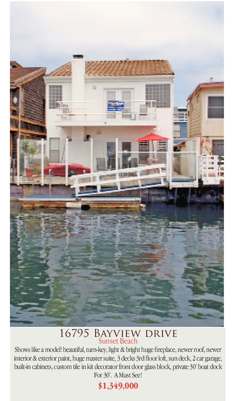 16795 Bayview drive Sunset Beach Shows like a model! beautiful, turn-key, light & bright huge fireplace, newer roof, newer interior & exterior paint, huge master suite, 3 decks 3rd floor loft, sun deck, 2 car garage, built-in cabinets, custom tile in kit decorator front door glass block, private 30’ boat dock For 30’. A Must See!