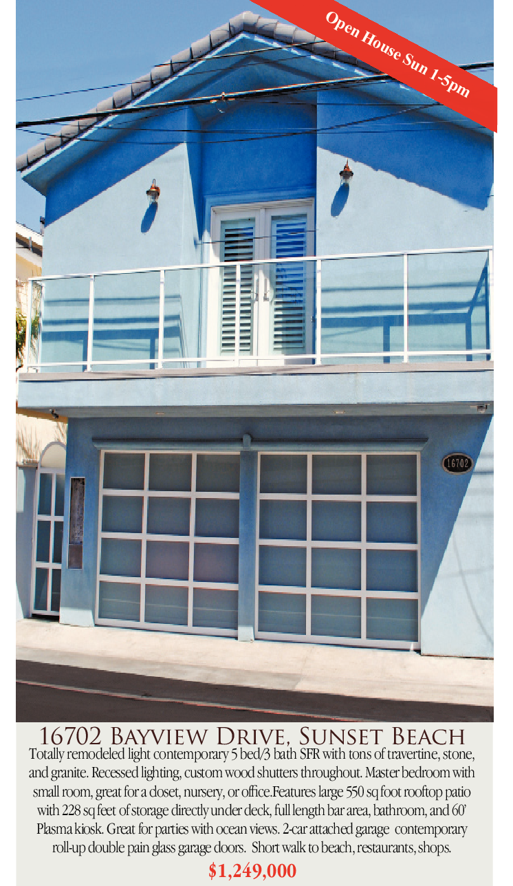 16702 Bayview Drive, Sunset Beach Totally remodeled light contemporary 5 bed/3 bath SFR with tons of travertine, stone, and granite. Recessed lighting, custom wood shutters throughout. Master bedroom with small room, great for a closet, nursery, or office.Features large 550 sq foot rooftop patio with 228 sq feet of storage directly under deck, full length bar area, bathroom, and 60’ Plasma kiosk. Great for parties with ocean views. 2-car attached garage contemporary roll-up double pain glass garage doors. Short walk to beach, restaurants, shops.