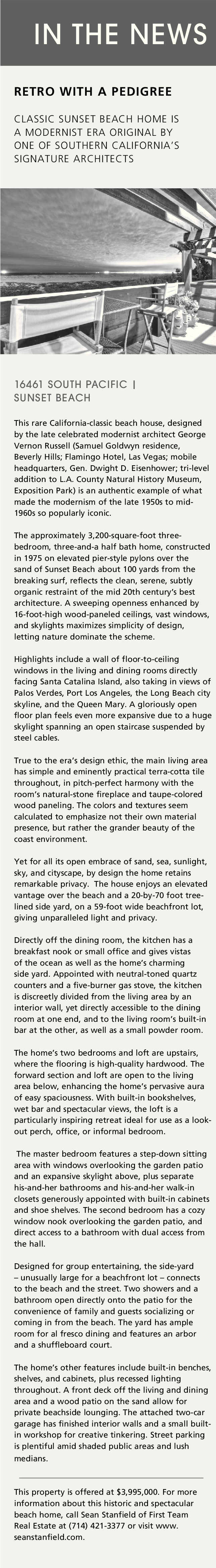 This property is offered at $3,995,000. For more information about this historic and spectacular beach home, call Sean Stanfield of First Team Real Estate at (714) 421-3377 or visit www. seanstanfield.com.