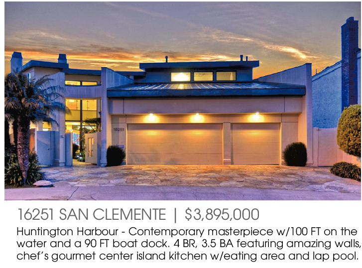 16251 SAN CLEMENTE | $3,895,000 Huntington Harbour - Contemporary masterpiece w/100 FT on the water and a 90 FT boat dock. 4 BR, 3.5 BA featuring amazing walls, chef’s gourmet center island kitchen w/eating area and lap pool.