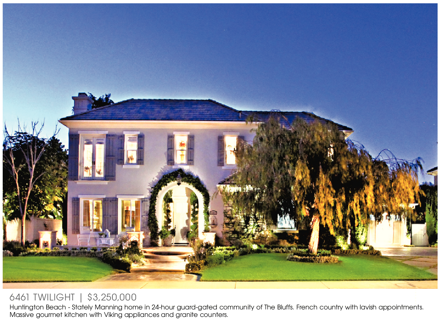 6461 TWILIGHT | $3,250,000 Huntington Beach - Stately Manning home in 24-hour guard-gated community of The Bluffs. French country with lavish appointments. Massive gourmet kitchen with Viking appliances and granite counters.