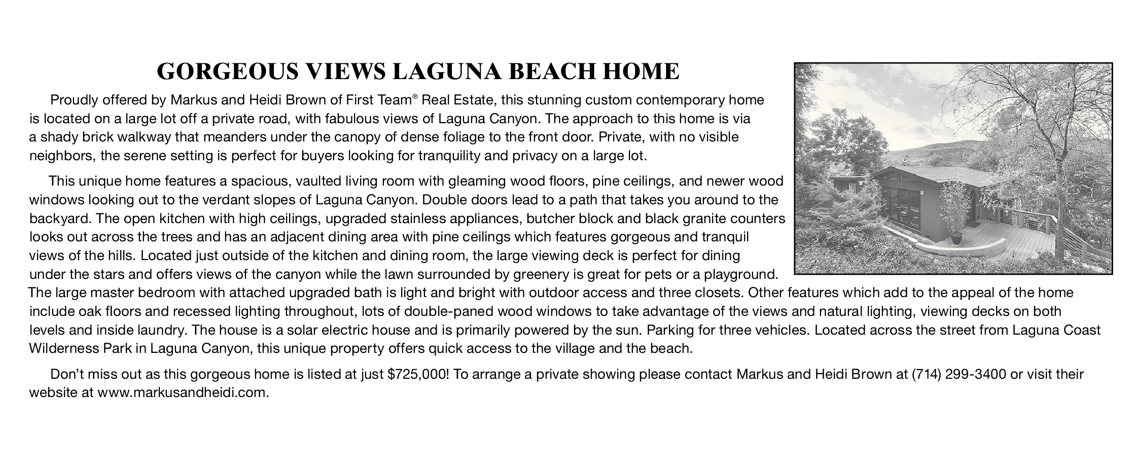 GORGEOUS VIEWS LAGUNA BEACH HOME Proudly offered by Markus and Heidi Brown of First Team ® Real Estate, this stunning custom contemporary home is located on a large lot off a private road, with fabulous views of Laguna Canyon. The approach to this home is via a shady brick walkway that meanders under the canopy of dense foliage to the front door. Private, with no visible neighbors, the serene setting is perfect for buyers looking for tranquility and privacy on a large lot. This unique home features a spacious, vaulted living room with gleaming wood floors, pine ceilings, and newer wood windows looking out to the verdant slopes of Laguna Canyon. Double doors lead to a path that takes you around to the backyard. The open kitchen with high ceilings, upgraded stainless appliances, butcher block and black granite counters looks out across the trees and has an adjacent dining area with pine ceilings which features gorgeous and tranquil views of the hills. Located just outside of the kitchen and dining room, the large viewing deck is perfect for dining under the stars and offers views of the canyon while the lawn surrounded by greenery is great for pets or a playground. The large master bedroom with attached upgraded bath is light and bright with outdoor access and three closets. Other features which add to the appeal of the home include oak floors and recessed lighting throughout, lots of double-paned wood windows to take advantage of the views and natural lighting, viewing decks on both levels and inside laundry. The house is a solar electric house and is primarily powered by the sun. Parking for three vehicles. Located across the street from Laguna Coast Wilderness Park in Laguna Canyon, this unique property offers quick access to the village and the beach. Don’t miss out as this gorgeous home is listed at just $725,000! To arrange a private showing please contact Markus and Heidi Brown at (714) 299-3400 or visit their website at www.markusandheidi.com.