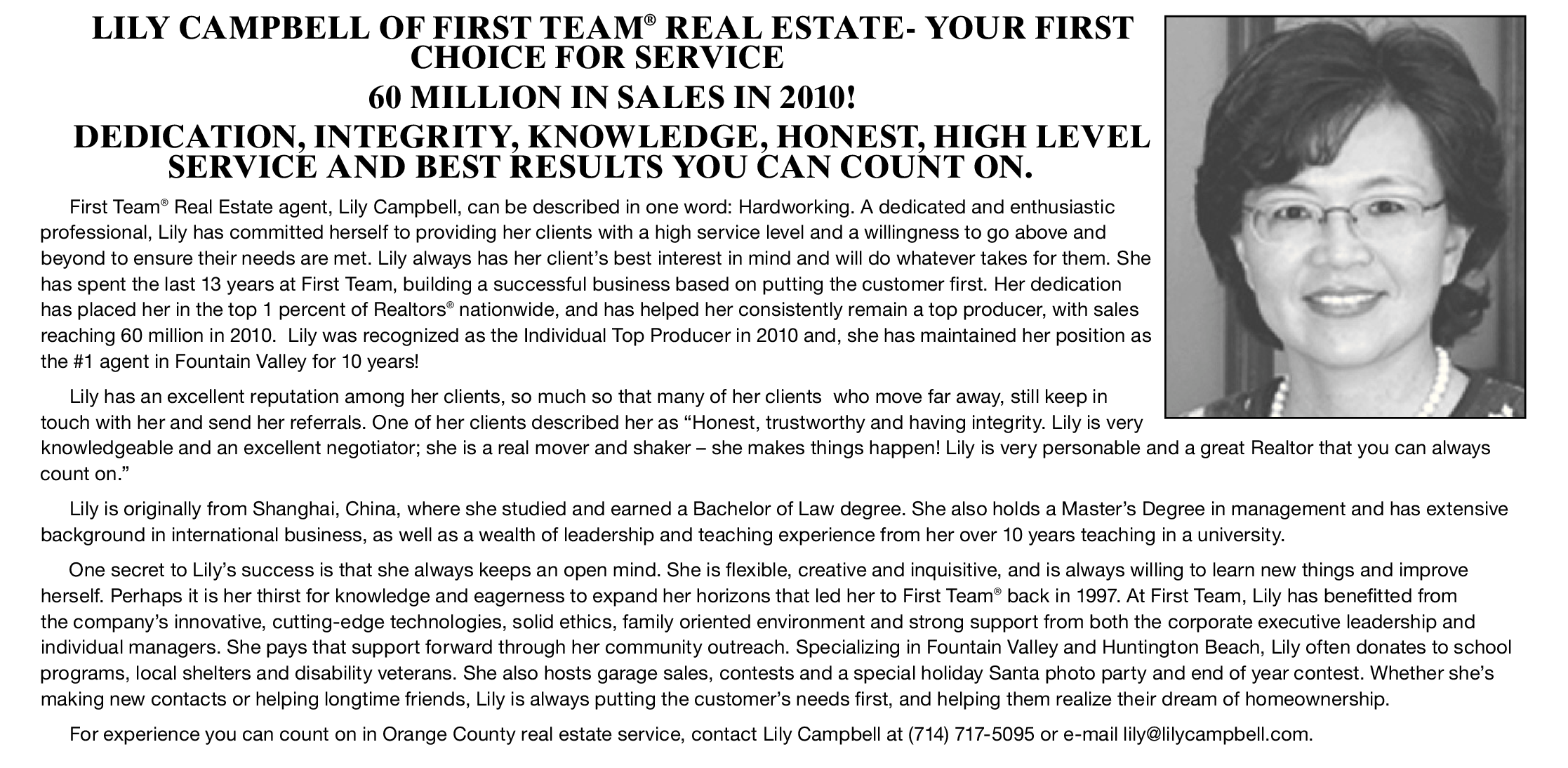 First Team ® Real Estate agent, Lily Campbell, can be described in one word: Hardworking. A dedicated and enthusiastic professional, Lily has committed herself to providing her clients with a high service level and a willingness to go above and beyond to ensure their needs are met. Lily always has her client’s best interest in mind and will do whatever takes for them. She has spent the last 13 years at First Team, building a successful business based on putting the customer first. Her dedication has placed her in the top 1 percent of Realtors ® nationwide, and has helped her consistently remain a top producer, with sales reaching 60 million in 2010. Lily was recognized as the Individual Top Producer in 2010 and, she has maintained her position as the #1 agent in Fountain Valley for 10 years!
