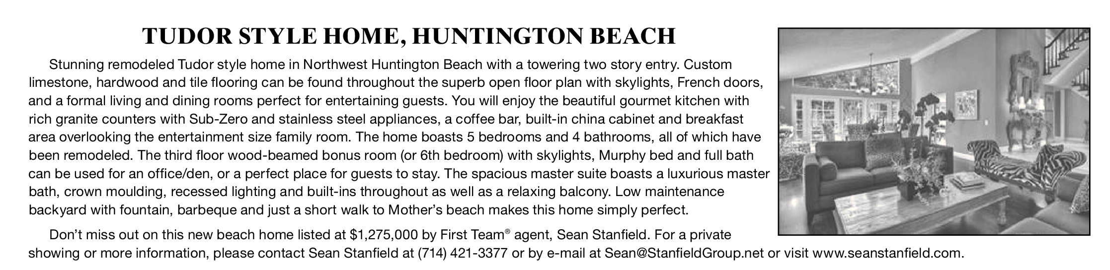 Don’t miss out on this new beach home listed at $1,275,000 by First Team ® agent, Sean Stanfield. For a private showing or more information, please contact Sean Stanfield at (714) 421-3377 or by e-mail at Sean@StanfieldGroup.net or visit www.seanstanfield.com.