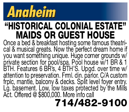 Anaheim “HISTORICAL COLONIAL ESTATE” MAIDS OR GUEST HOUSE Once a bed & breakfast hosting some famous theatrical & musical greats. Now the perfect dream home if you want something unique. Huge corner grounds w/ private section for pool/spa. Pool house w/1 BR & 1 BTH. Features 6 BR’s, 4 BTH’S. Upgd. over time w/ attention to preservation. Frml. din. parlor. C/A custom frplc, mantle, balcony & decks. Split level foyer entry. Lg. basement. Low, low taxes protected by the Mills Act. Offered @ $800,000. More info call 714/482-9100