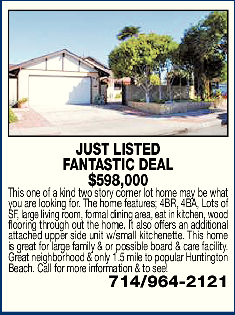 JUST LISTED FANTASTIC DEAL $598,000 This one of a kind two story corner lot home may be what you are looking for. The home features; 4BR, 4BA, Lots of SF, large living room, formal dining area, eat in kitchen, wood flooring through out the home. It also offers an additional attached upper side unit w/small kitchenette. This home is great for large family & or possible board & care facility. Great neighborhood & only 1.5 mile to popular Huntington Beach. Call for more information & to see!