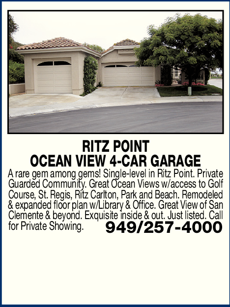 RITZ POINT OCEAN VIEW 4-CAR GARAGE A rare gem among gems! Single-level in Ritz Point. Private Guarded Community. Great Ocean Views w/access to Golf Course, St. Regis, Ritz Carlton, Park and Beach. Remodeled & expanded floor plan w/Library & Office. Great View of San Clemente & beyond. Exquisite inside & out. Just listed. Call for Private Showing. 949/257-4000