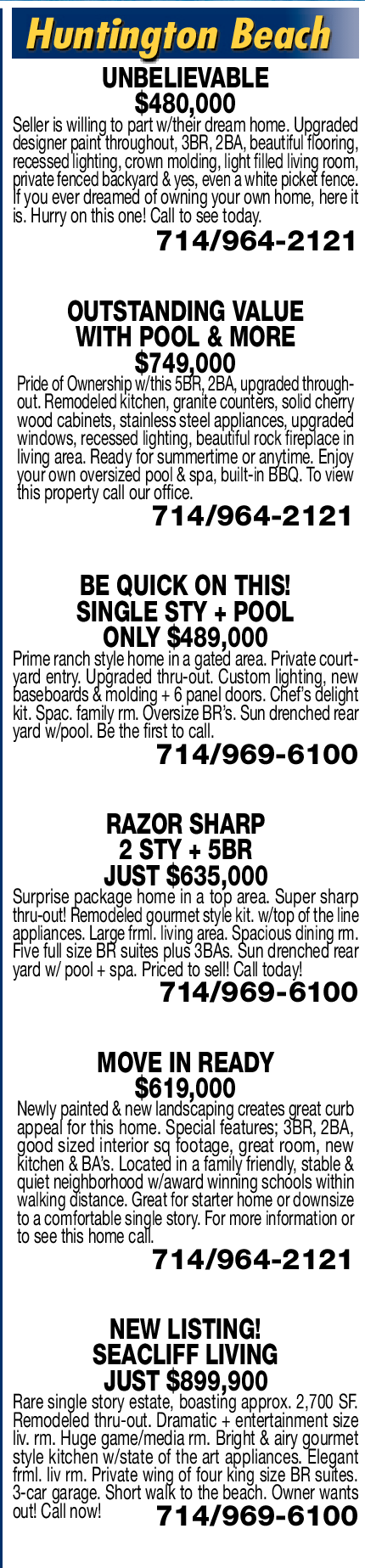 SEACLIFF LIVING JUST $899,900 Rare single story estate, boasting approx. 2,700 SF. Remodeled thru-out. Dramatic + entertainment size liv. rm. Huge game/media rm. Bright & airy gourmet style kitchen w/state of the art appliances. Elegant frml. liv rm. Private wing of four king size BR suites. 3-car garage. Short walk to the beach. Owner wants out! Call now! 714/969-6100