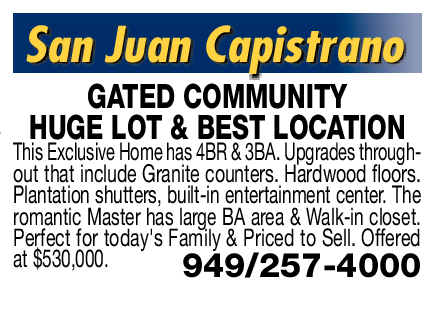 949/597-4000 Single Large San Juan Capistrano GATED COMMUNITY HUGE LOT & BEST LOCATION This Exclusive Home has 4BR & 3BA. Upgrades throughout that include Granite counters. Hardwood floors. Plantation shutters, built-in entertainment center. The romantic Master has large BA area & Walk-in closet. Perfect for today's Family & Priced to Sell. Offered at $530,000. 949/257-4000 See also