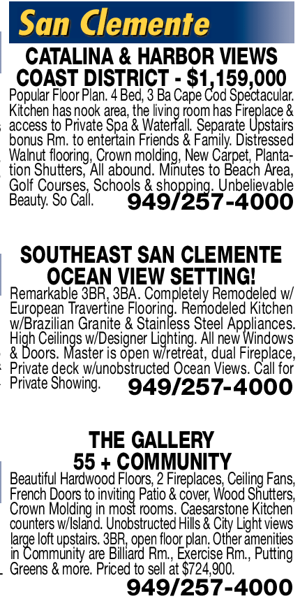 San Clemente CATALINA & HARBOR VIEWS COAST DISTRICT - $1,159,000 Popular Floor Plan. 4 Bed, 3 Ba Cape Cod Spectacular. Kitchen has nook area, the living room has Fireplace & access to Private Spa & Waterfall. Separate Upstairs faucets, bonus Rm. to entertain Friends & Family. Distressed C/A. Walnut flooring, Crown molding, New Carpet, Plantation Shutters, All abound. Minutes to Beach Area, frplc. Golf Courses, Schools & shopping. Unbelievable 714/482-9100 Beauty. So Call. 949/257-4000 heater, & & 949/597-4000 Totally w/view 949/597-4000 SOUTHEAST SAN CLEMENTE OCEAN VIEW SETTING! Remarkable 3BR, 3BA. Completely Remodeled w/ European Travertine Flooring. Remodeled Kitchen w/Brazilian Granite & Stainless Steel Appliances. High Ceilings w/Designer Lighting. All new Windows & Doors. Master is open w/retreat, dual Fireplace, Private deck w/unobstructed Ocean Views. Call for Private Showing. 949/257-4000 THE GALLERY 55 + COMMUNITY Beautiful Hardwood Floors, 2 Fireplaces, Ceiling Fans, French Doors to inviting Patio & cover, Wood Shutters, Crown Molding in most rooms. Caesarstone Kitchen counters w/Island. Unobstructed Hills & City Light views large loft upstairs. 3BR, open floor plan. Other amenities in Community are Billiard Rm., Exercise Rm., Putting Greens & more. Priced to sell at $724,900. 949/257-4000